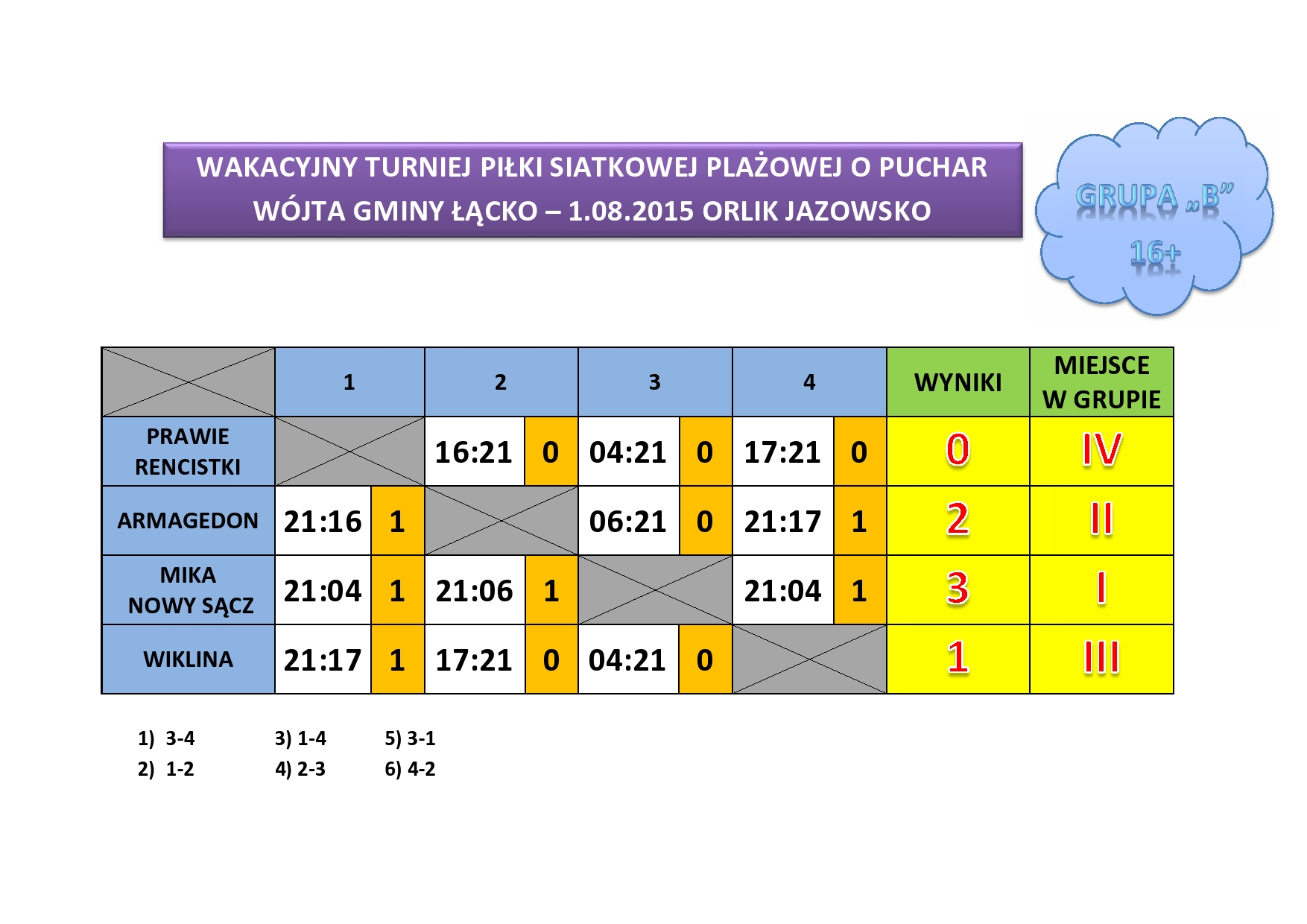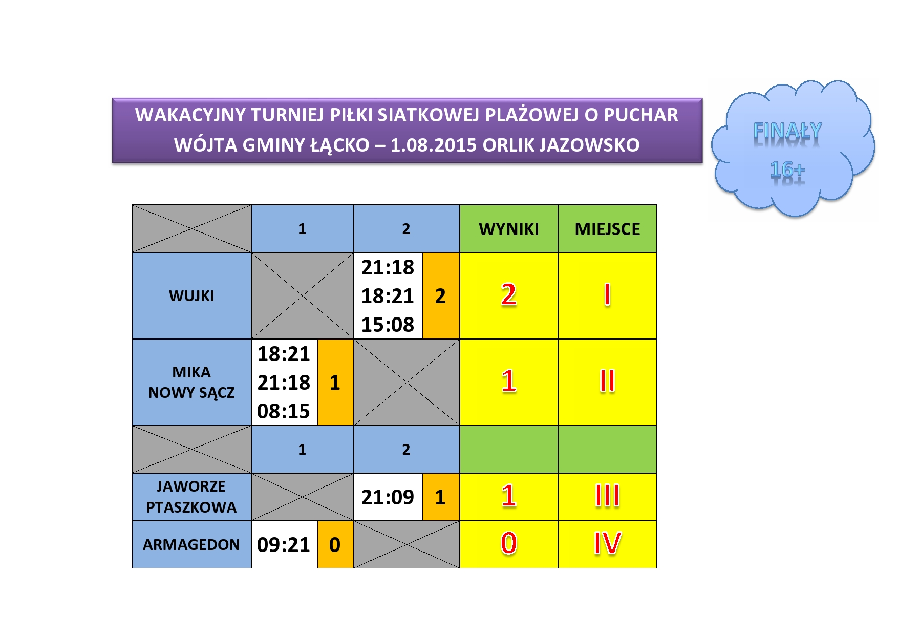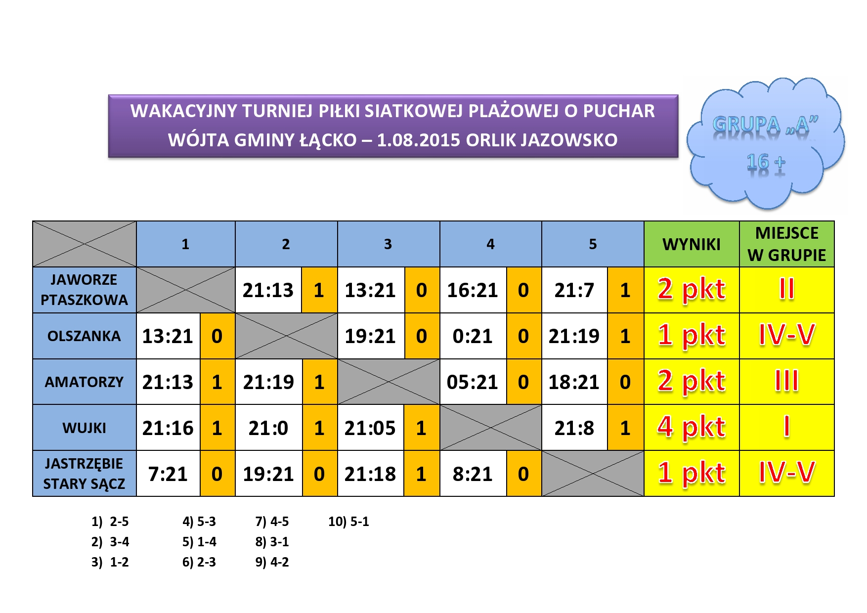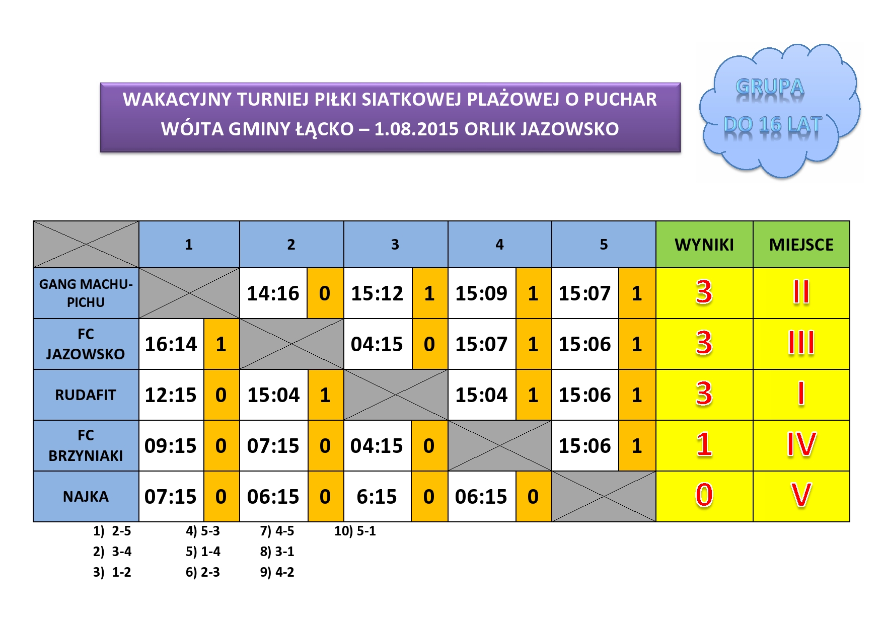 W sobotę 1 sierpania na orliku w Jazowsku rozegrano turniej piłki plażowej. Pogoda sprzyjała, emocji nie brakowało!. W kategorii 16+ zwyciężyła drużyna "Wujki" z Nowego Sącza. W kategorii do lat 16 triumfowała ekipa "Rudafit".Poniżej szczegółowe wyniki.