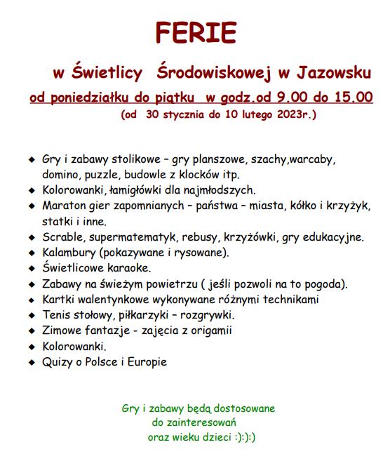 Trwają ferie zimowe, dzieci i młodzież mają sporo czasu, które dobrze jest odpowiednio wykorzystać. Świetlica środowiskowa – to ośrodek użyteczności publicznej, wspierający lokalną społeczność w procesie wychowywania dzieci i młodzieży i tak samo jest w okresie ferii zimowych. Poniżej propozycję przygotowane przez świetlicę z Jazowska i Obidzy. Pełna oferta przygotowana przez pozostałe placówki dostępna jest na stronie gminy.
