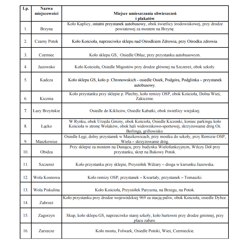 W SPRAWIE WYKAZU TABLIC OGŁOSZENIOWYCH NA TERENIE GMINY ŁĄCKO PRZEZNACZONYCH NA BEZPŁATNE UMIESZCZENIE URZĘDOWYCH OBWIESZCZEŃ WYBORCZYCH I PLAKATÓW WSZYSTKICH KOMITETÓW WYBORCZYCH