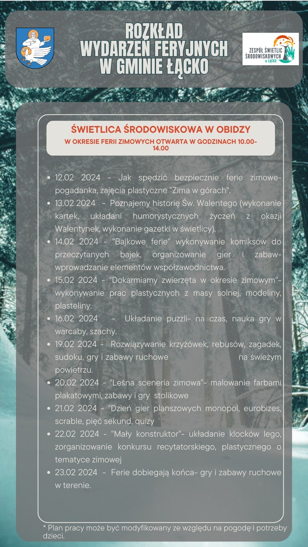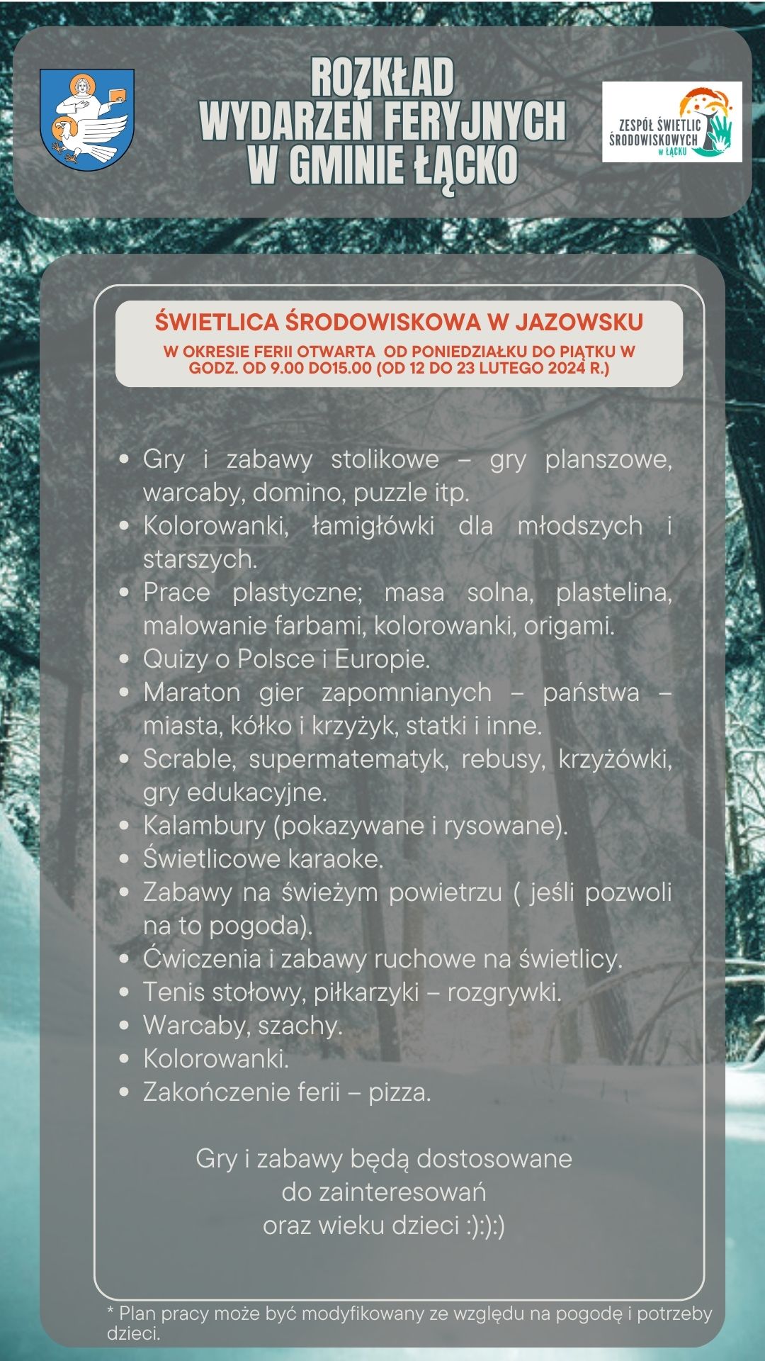 Przed nami dwa tygodnie ferii zimowych i to raczej w pogodzie zostawiającej wiele do życzenia jeżeli chodzi o warunki śniegowe. Warto w tym czasie skorzystać z przygotowanej propozycji przez ośrodki działające w naszej gminie. . Świetlica środowiskowa – to ośrodek użyteczności publicznej, wspierający lokalną społeczność w procesie wychowywania dzieci i młodzieży i tak samo jest w okresie ferii zimowych. Poniżej propozycję przygotowane przez świetlicę z Jazowska i Obidzy. Pełna oferta przygotowana przez pozostałe placówki dostępna jest na stronie gminy (facebook)