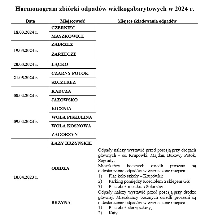 HARMONOGRAM ZBIÓRKI ODPADÓW WIELKOGABARYTOWYCH W 2024 r.