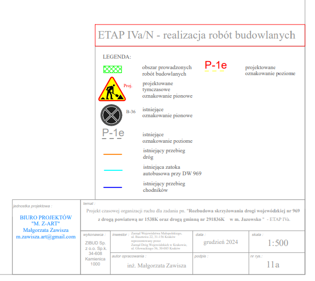 W związku z wprowadzeniem ruchu wahadłowego na DW969 (rysunek) Droga na kościół będzie całkowicie zamknięta dla ruchu. Planowane jest przełożenie ruchu dla skręcających i wyjeżdżających z Drogi Wojewódzkiej na Drogę Powiatową na Obidza, Brzyna w śladzie nowego ronda.