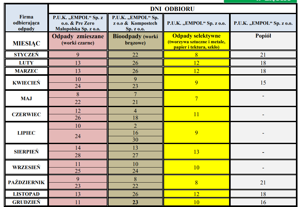 Harmonogram odbioru odpadów w 2024 roku dla wybranych miejscowości w Gminie Łącko.