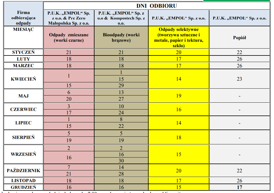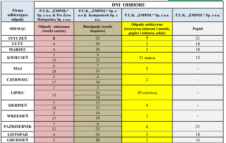 HARMONOGRAM ODBIORU ODPADÓW W 2025 ROKU