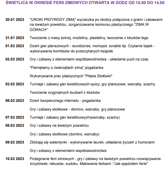 Trwają ferie zimowe, dzieci i młodzież mają sporo czasu, które dobrze jest odpowiednio wykorzystać. Świetlica środowiskowa – to ośrodek użyteczności publicznej, wspierający lokalną społeczność w procesie wychowywania dzieci i młodzieży i tak samo jest w okresie ferii zimowych. Poniżej propozycję przygotowane przez świetlicę z Jazowska i Obidzy. Pełna oferta przygotowana przez pozostałe placówki dostępna jest na stronie gminy.