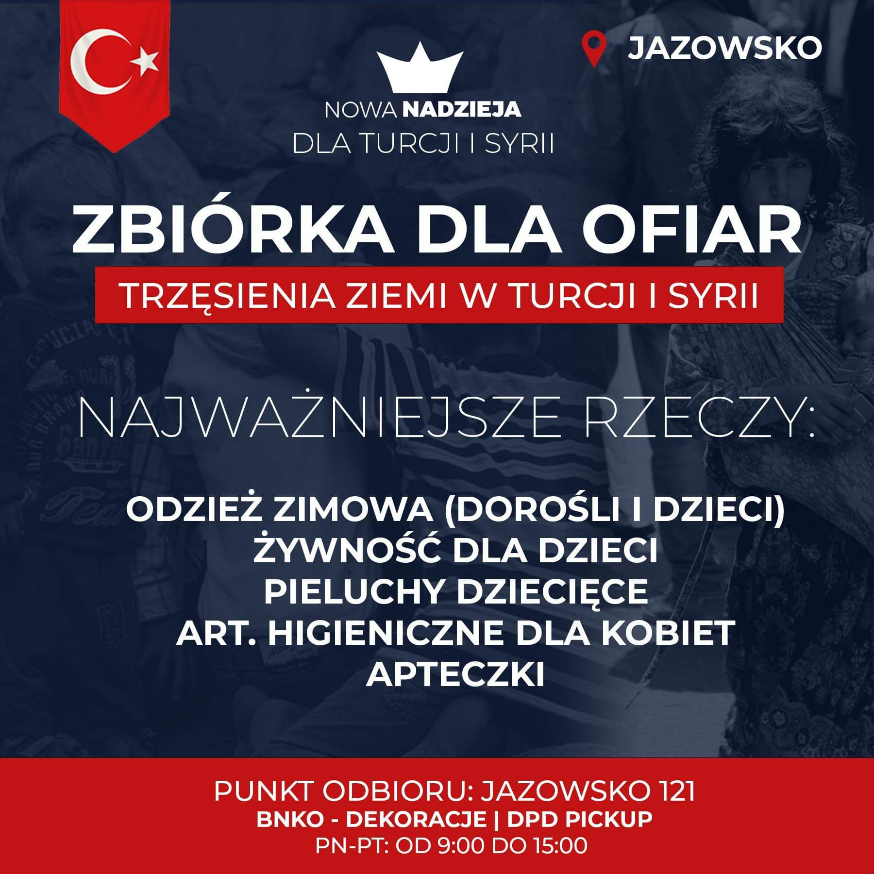 W naszym regionie ruszyła zbiórka darów dla ofiar trzęsienia ziemi w Turcji i Syrii. Wyznaczono dwa punkty odbioru w Nowym Sączu i właśnie w Jazowsku. Szczegółowe informację odnośnie m.in. organizatorów akcji - kliknij Punkt zbiórki w Jazowsku znajduję się w firmie BNKO -DEKORACJE Jazowsko 121 - naprzeciw domu handlowego (przy głównej drodze)