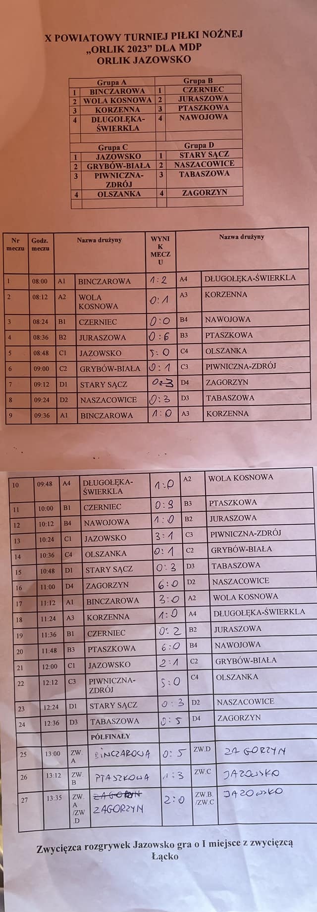 Do X Powiatowego Turnieju Piłki Nożnej ORLIK 2023 dla Młodzieżowych Drużyn Pożarniczych rozgrywanych w Jazowsku i Łącku zgłosiło się 31 drużyn. Bardzo dobrze radzi sobie ekipa z Jazowska, która zajęła 1 miejsce w grupie pokonując: Grybów Biała 2-1, Olszankę 5:0 i Piwniczną Zdrój 3-1. Końcowe wyniki podamy niebawem uaktualniając wpis.